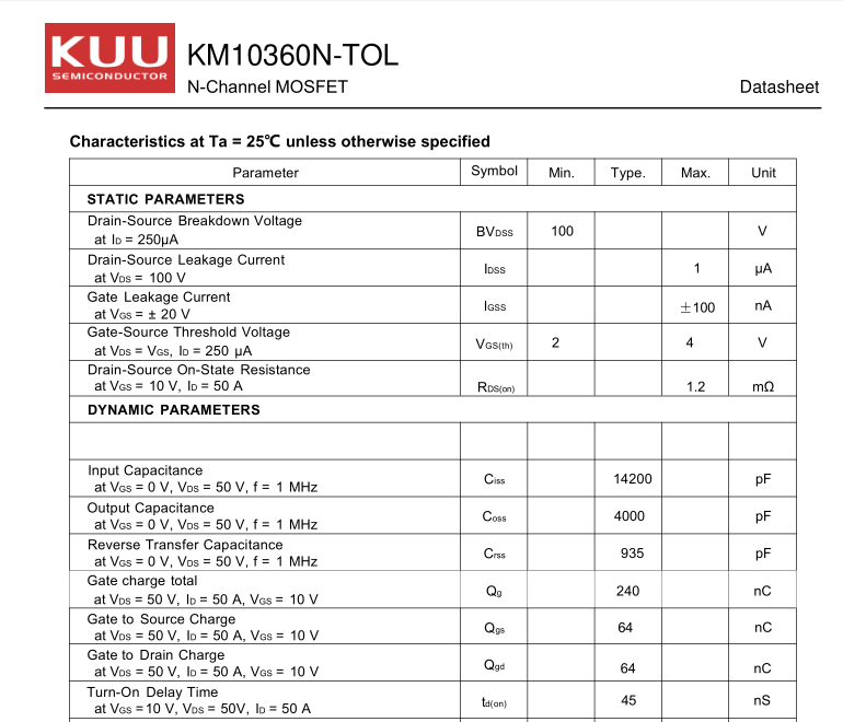在現代智能電子設備中,體積與效率的博弈從未停止。為應對5G、新能源、汽車電子對高密度設計的需求,其中,MOSFET作為電源管理的核心器件,我們KUU原廠推出全新產品——MOSFET「 KM10360N-TOL」。以1.2mΩ超低內阻、100V耐壓和極致散熱性能,還采用了先進的TOLL封裝技術,重新定義小型化電源方案的新邊界!